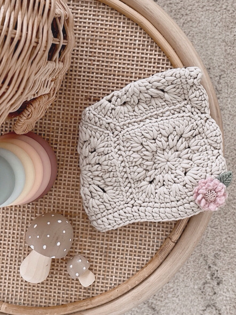 Elevate your little one's style with our hand-woven baby bonnet, adorned with plush flower appliques. Crafted with care and attention to detail, this bonnet features a soft tie closure, ensuring a comfortable fit for newborns up to 6 months. Made from the finest materials, it's luxuriously soft and gentle on delicate skin. Perfect for gifting, each bonnet exudes bohemian charm and artisanal flair. Choose from our selection of four plush flower colors to match any ensemble. Add a touch of whimsy to your baby's wardrobe with this 100% handmade accessory, destined to become a cherished keepsake.