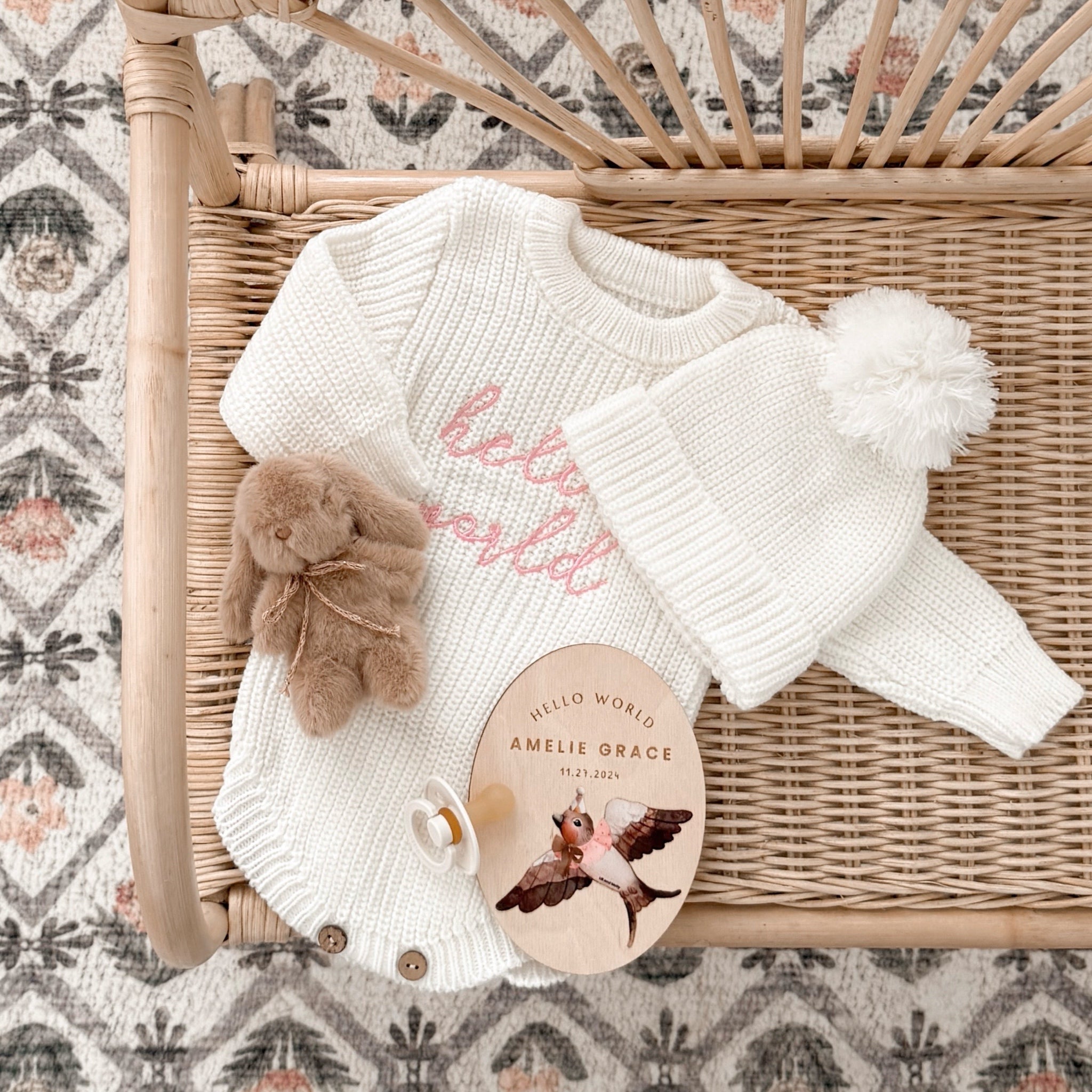 Introducing our beautiful cosy 'Hello World' Chunky Knit Bundle! We've put together the most adorable set for the cutest debut outfit for your little love.